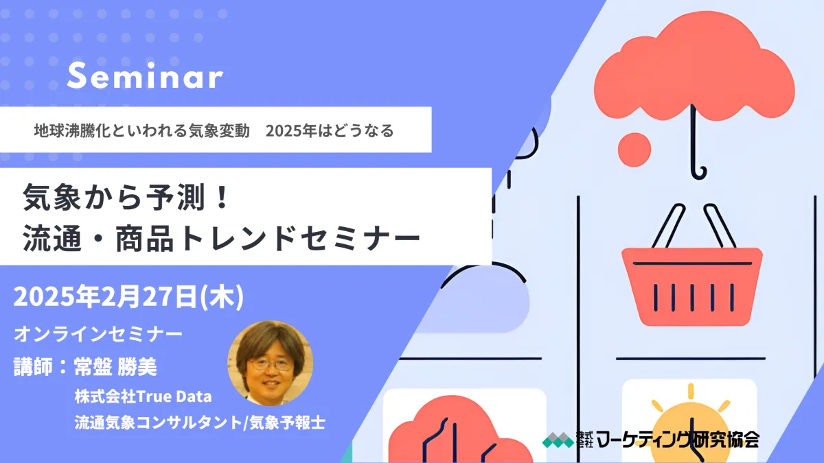 株式会社マーケティング研究協会は、2025年2月27日(木)に特別に設けられた「気象から予測!流通・商品トレンドセミナー」をオンラインで開催します。このセミナーは、急速に進む気候変動が流通業界や消費者の購買行動に与える影響を深く掘り下げる機会です。