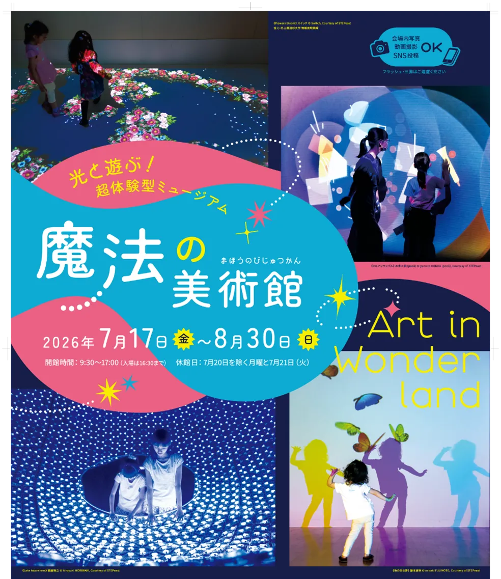 「魔法の美術館」は、2026年7月17日(金)から8月30日(日)までの期間限定で開催されます。ただし、7月20日(月)を除く月曜日と7月21日(火)は休館日となります。開館時間は午前9時30分から午後5時までで、最終入場は午後4時30分です。