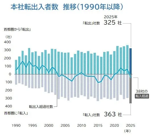 このデータによると、首都圏からは325社が地方に移転しました。移転の結果、転入企業数から転出企業数を引いた結果は38社の「転入超過」となり、これはコロナ禍の2020年(8社)以来の増加を示します。企業が首都圏に移転する動きが再び活発になっているといえるでしょう。
