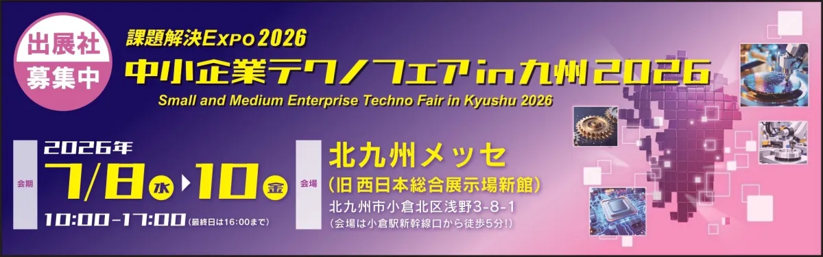 2026年7月8日(水)から10日(金)までの3日間、福岡県北九州市で開催される「中小企業テクノフェアin九州2026」の出展社を募集中です。この展示会は、中小企業の振興を目的とし、“ものづくり”に注力する企業が自社の開発製品や技術を広くPRする場として位置付けられています。