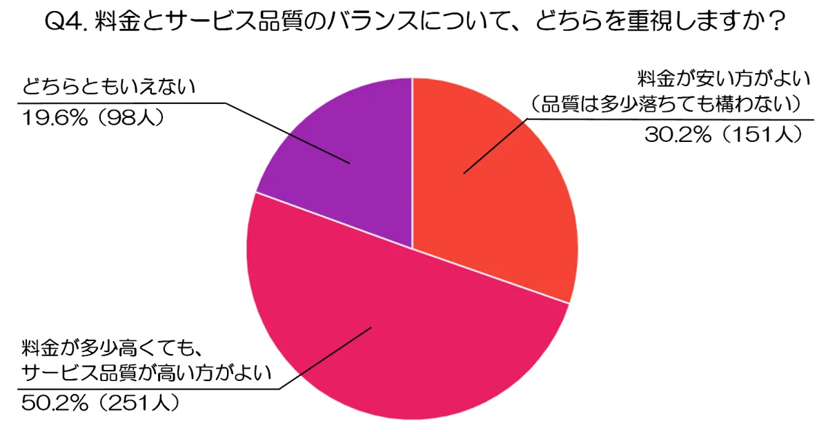 調査の結果、最も多くの利用者が「料金が多少高くても、サービス品質が高い方が好ましい」と回答しました。これは、水道問題が生活に直結することから、作業の確実性や信頼性が重視されていることを示しています。特に、急なトラブルにおいては、再発防止や安全性を考慮し、品質の高いサービスを求める傾向が強まります。このような視点から、価格以上の価値が求められることが明らかになりました。