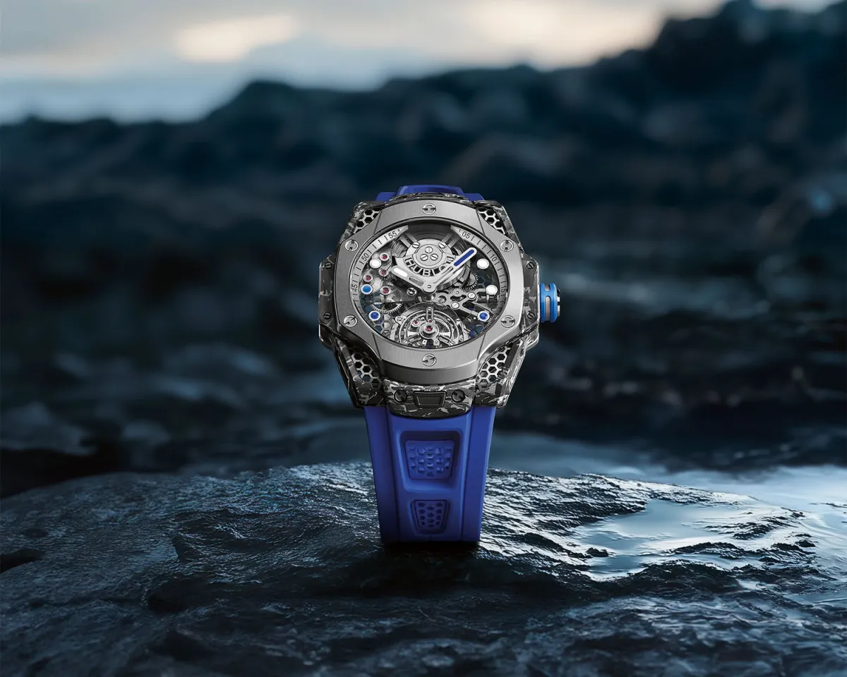 「ビッグ・バン トゥールビヨン」は直径44mm、厚さは13.75mmとダイナミックなサイズ感を持っており、目を引くハニカムパターンのグレー仕上げが施されています。ベゼルはサテン仕上げで、サイドには光沢感のあるマイクロブラスト仕上げが使用されており、ダークブルーとライトブルーのツートンカラーが針とインデックスを際立たせています。特に明るいブルーはリューズにも施されていて、視覚的なアクセントとなっています。