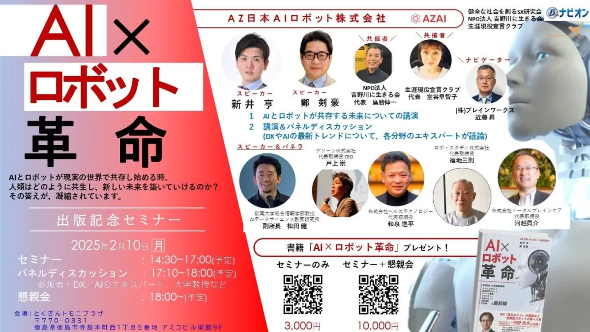 2025年2月10日(月)、徳島市のとくぎんトモニプラザにおいて、「AI×ロボット革命」の出版記念セミナーが開催される。このセミナーでは、AIおよびロボットが私たちの生活にどのような影響を与えるのか、そして共存する未来に向けた課題や期待が議論される。