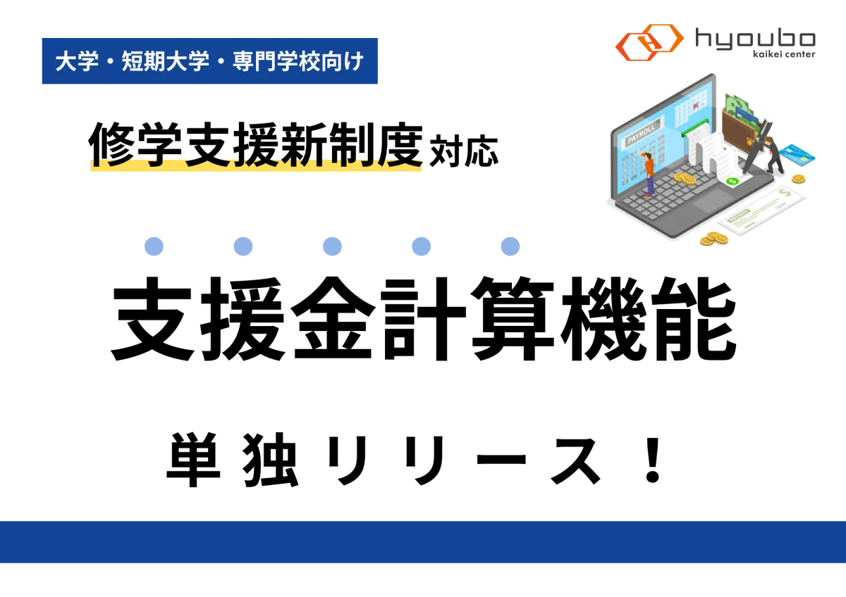株式会社票簿会計センター(以下、票簿会計センター)は、2025年8月より大学や専門学校向けの「学費管理システムR2」オプションとして提供していた「支援金計算機能」を、機能単独でリリースしました。このリリースは、学校からの多くの要望に応えるものであり、修学支援新制度に完全に対応しています。