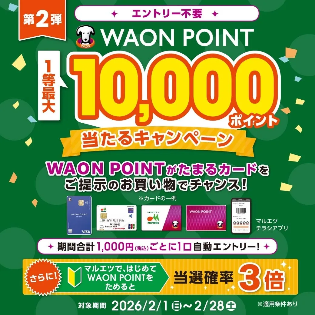株式会社マルエツが実施するWAON POINTキャンペーンが、2026年2月1日から2月28日までの期間限定で開催中です。このキャンペーンでは、マルエツ全店(魚悦糀谷店を除く)でWAON POINTが貯まるカードを用いてお買い物することで、多彩なポイントが抽選で当たるチャンスがあります。