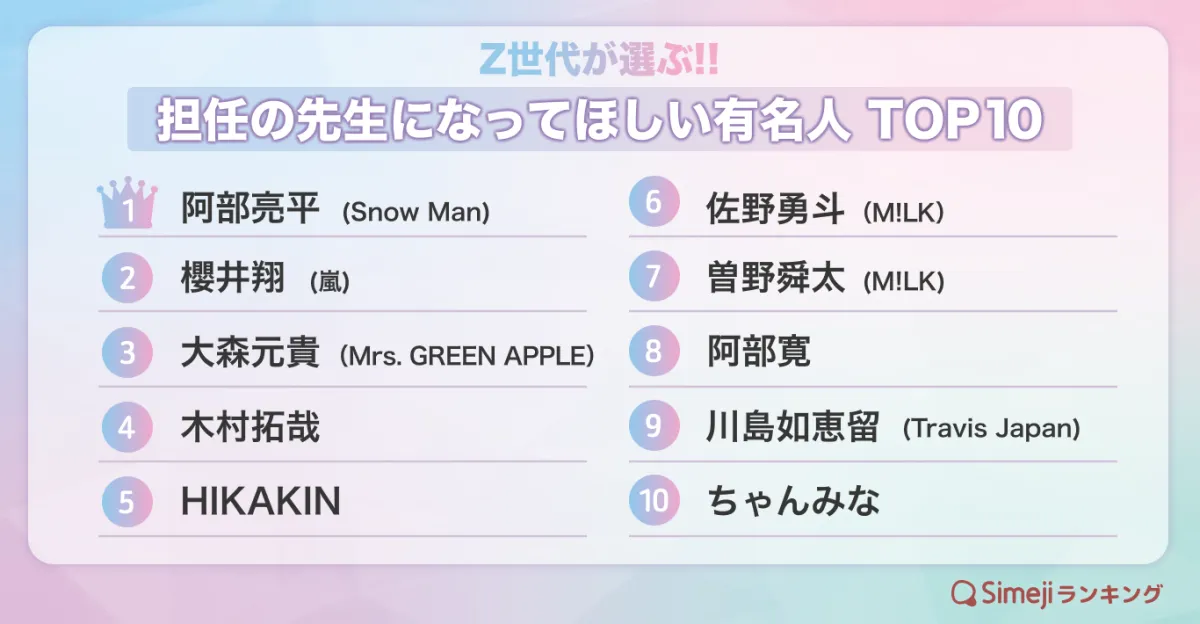 見事1位に輝いたのは、アイドルグループ「Snow Man」の阿部亮平さん。彼は高学歴であることでも知られ、「優しく教えてくれそう」との声が多く寄せられた。また、彼が出演した「3年J組阿部ちゃん先生」の影響もあり、「阿部ちゃんが担任なら毎日頑張れそう」というコメントも。このように、知性と優しさを持ち合わせた理想の先生像が支持を受けた。