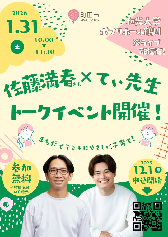 東京都町田市にて、人気のトークイベント「佐藤満春さん×てぃ先生 トークイベント~まちだで子どもにやさしい子育て!~」が2023年1月31日(土)に開催されることが決定しました。このイベントは、昨年度に引き続き開催されるもので、前回参加者からは「子育てに役立つ内容だった」との感想が寄せられ、その満足度は100%に達しました。