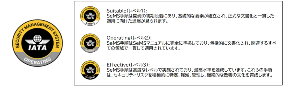 このプログラムでは、航空保安に関するリスクを事前に特定し、予防措置を講じることで、保安管理の継続的な改善を目指します。航空保安管理の成熟度は3段階に評価され、各段階を通じたリスク管理の強化と、業界全体のセキュリティ水準の向上が求められています。