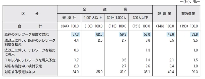 改正育児・介護休業法は、育児や介護中の従業員が働きやすい環境を整備することを目的としており、特にテレワーク制度の整備や雇用環境の改善が求められています。本調査は、各企業がこの法改正にどのように対応しているかを把握するために実施されました。