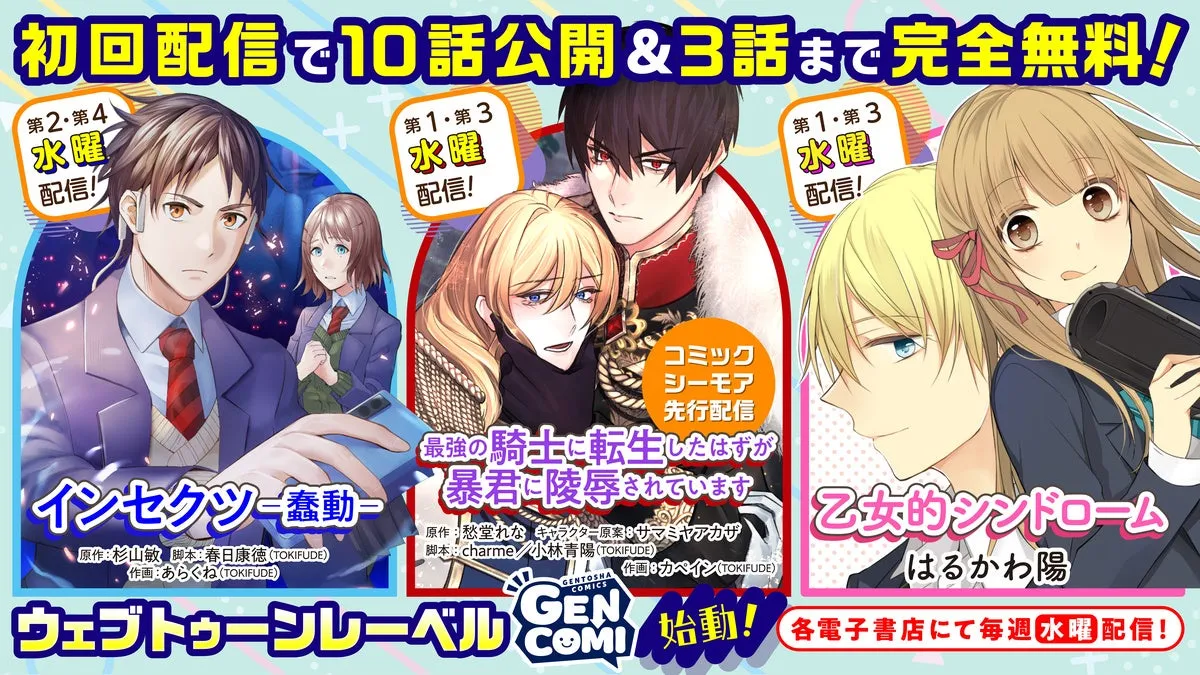 初めて配信される作品として、「最強の騎士に転生したはずが暴君に陵辱されています」と「乙女的シンドローム」の2作品がラインナップされています。「最強の騎士に転生したはずが暴君に陵辱されています」は、コミックシーモアにて先行して配信される予定で、初回配信では一挙に10話が公開されます。また、最初の3話は完全無料で提供されるので、ぜひ手に取ってみてください。