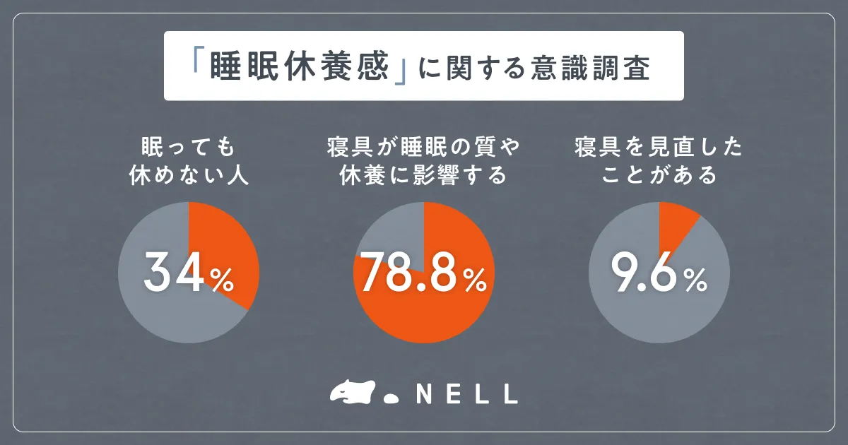 現代では、睡眠を脳波や体動のデータで客観的に測るスリープテック技術が進日しているが、個々人の「眠れている感覚」にも大きな偏りがある。「客観的には眠れているが、実感が伴わない」という問題が浮上してきている。NELLはこのギャップに注目し、「ただ眠るのではなく、休める睡眠」づくりを進めている。実際、78.8%が「寝具が睡眠の質に影響する」と感じているものの、それを行動に移している人はわずか9.6%にとどまっている。
