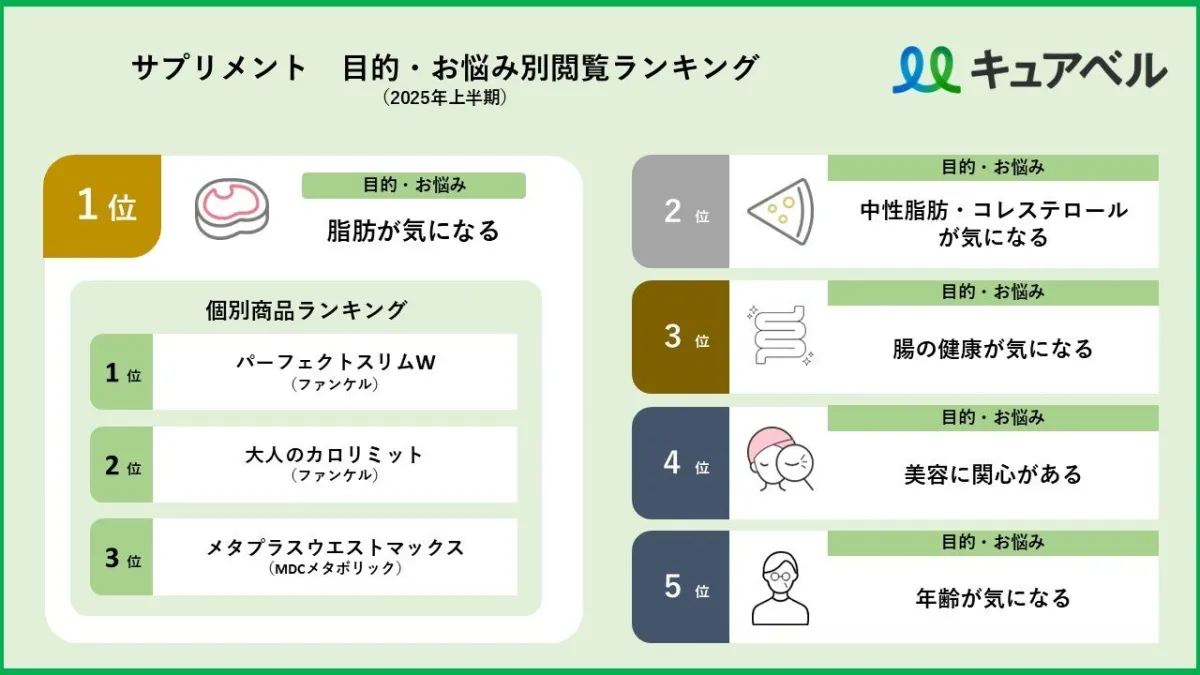2025年度の上半期におけるサプリメントの人気商品が明らかになりました。ウィルベース株式会社が運営するサプリ選定支援サイト「キュアベル」のデータをもとに、4月から9月までの期間に使われたユーザーたちのアクセス情報を分析した結果です。今回は、「脂肪が気になる」「中性脂肪・コレステロールが気になる」「腸の健康が気になる」という3つの目的別に、特に人気のあった商品をランキング形式でご紹介します。