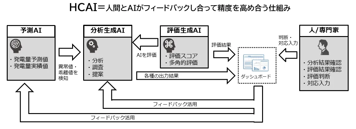 本プロジェクトでは、各要素においてAIと人間が協力して行動します。予測を担当するAIは、過去のデータや気象の情報を基に太陽光発電量を予想します。これにより、発電量の変動を事前に把握することが可能になります。次に、生成AIがこの予測結果と実績データを総合的に分析し、原因を探る提案を行います。