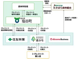 提携したのは塩谷町、たかはら森林組合、住友林業株式会社、NTTドコモビジネス株式会社の4者です。まず、町の私有林に関する意向調査が行われ、約2,000haにわたる森林所有者からJ-クレジットの創出についての意向を確認します。この取り組みは、2027年に予定されているクレジットの販売を見据えたものです。