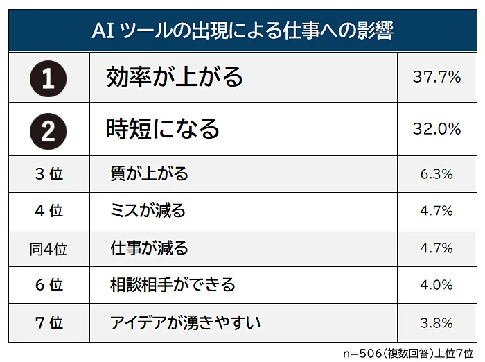 調査結果によると、83%の respondents がAIツールの出現が仕事に良い影響を与えていると回答しました。最も多かった意見は「効率が上がる」で、37.7%がこれに該当しました。AIの導入によって、具体的には書類作成や情報収集がスムーズになったという意見が多く、従来人間が行っていた業務が大幅に短縮されたことが伺えます。