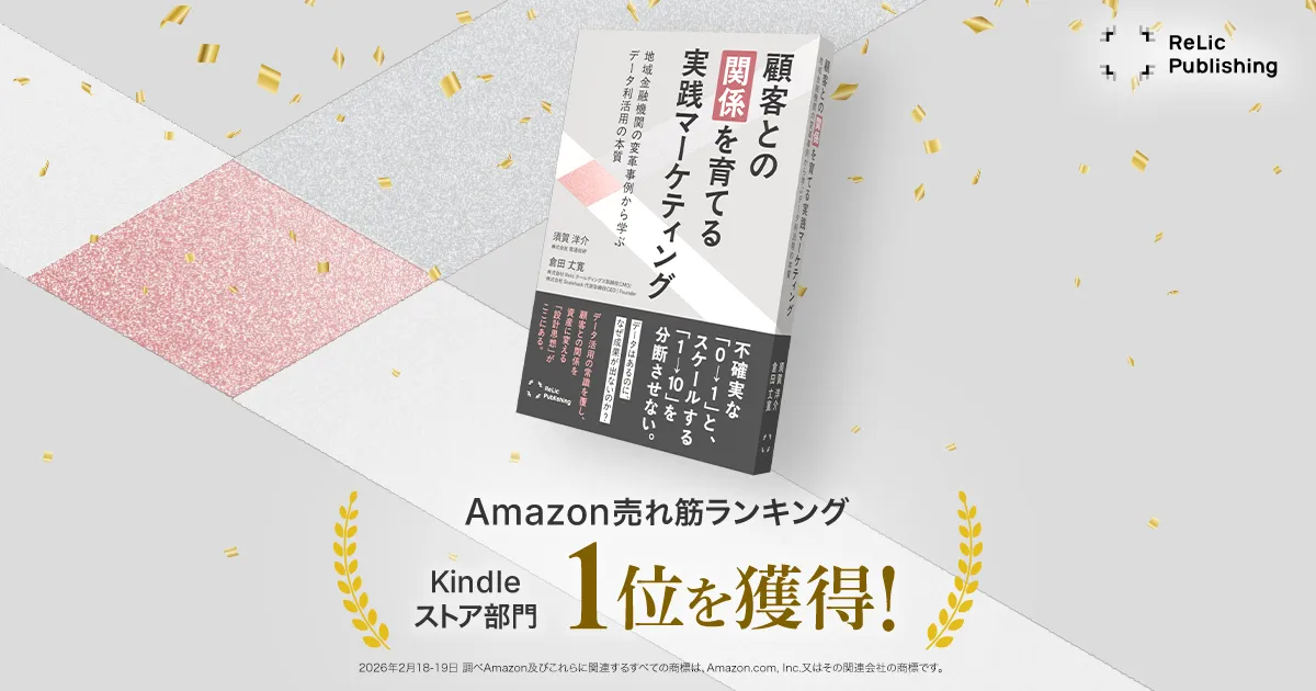 2026年2月18日に株式会社Relicがリリースした新書『顧客との「関係」を育てる実践マーケティング──地域金融機関の変革事例から学ぶデータ利活用の本質』が、瞬く間にAmazon Kindleストアの総合ランキングで1位を獲得しました。本書は、地域金融機関を題材に、顧客との関係構築に必要なマーケティング手法とデータ利活用の重要性について、筆者である倉田丈寛氏と須賀洋介氏の経験を元にした具体的な方法論を提示しています。