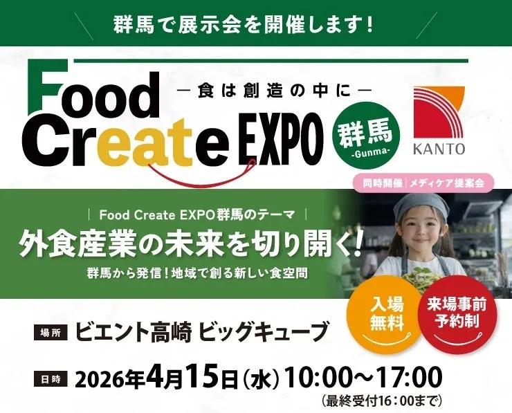 株式会社シェアダインは、2026年4月15日(水)に群馬県高崎市で行われる「Food Create EXPO 群馬 2026」に出展します。このイベントは、飲食業界に特化した貴重な展示の場であり、シェフリンクを紹介する良い機会です。シェフリンクは、料理人と飲食、宿泊業者を結ぶ総合プラットフォームで、これを通じて人材課題に対する新たな選択肢を提案します。