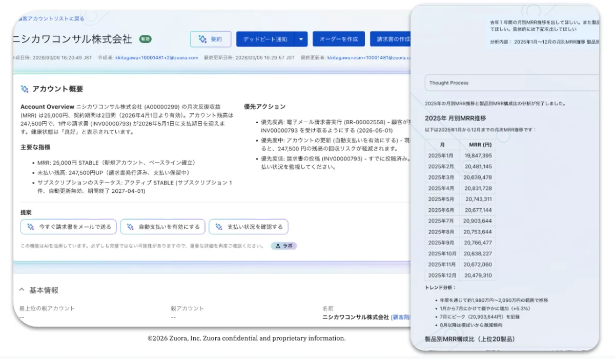 「Zuora AI」は財務業務において、AIが財務データを分析し、実行可能な業務アクションまで一貫して支援することで、より効率的なプロセスを実現します。明確な内部統制と権限設定を守りながら、CFO(最高財務責任者)が安心して利用できる信頼性を提供します。