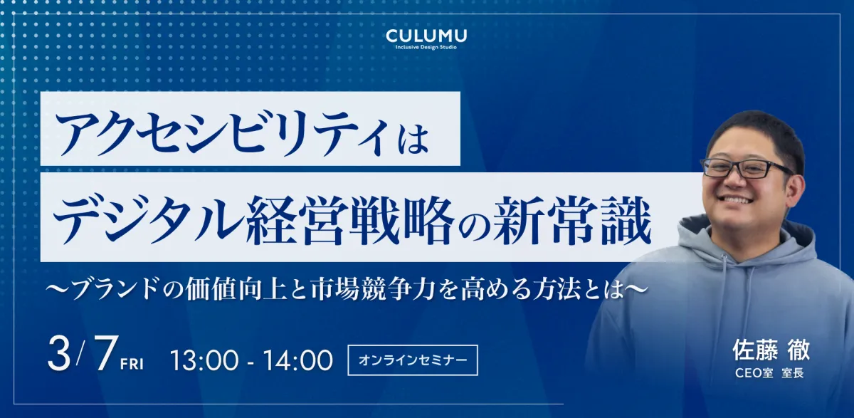 2025年3月7日(金)13時より、株式会社STYZによるオンラインセミナー「アクセシビリティはデジタル経営戦略の新常識」を開催します。このセミナーは、アクセシビリティがどのように企業のブランド価値や競争力に寄与するのかを、具体的なデータや成功事例を通じて解説します。参加は無料で、オンラインでの参加が可能です。