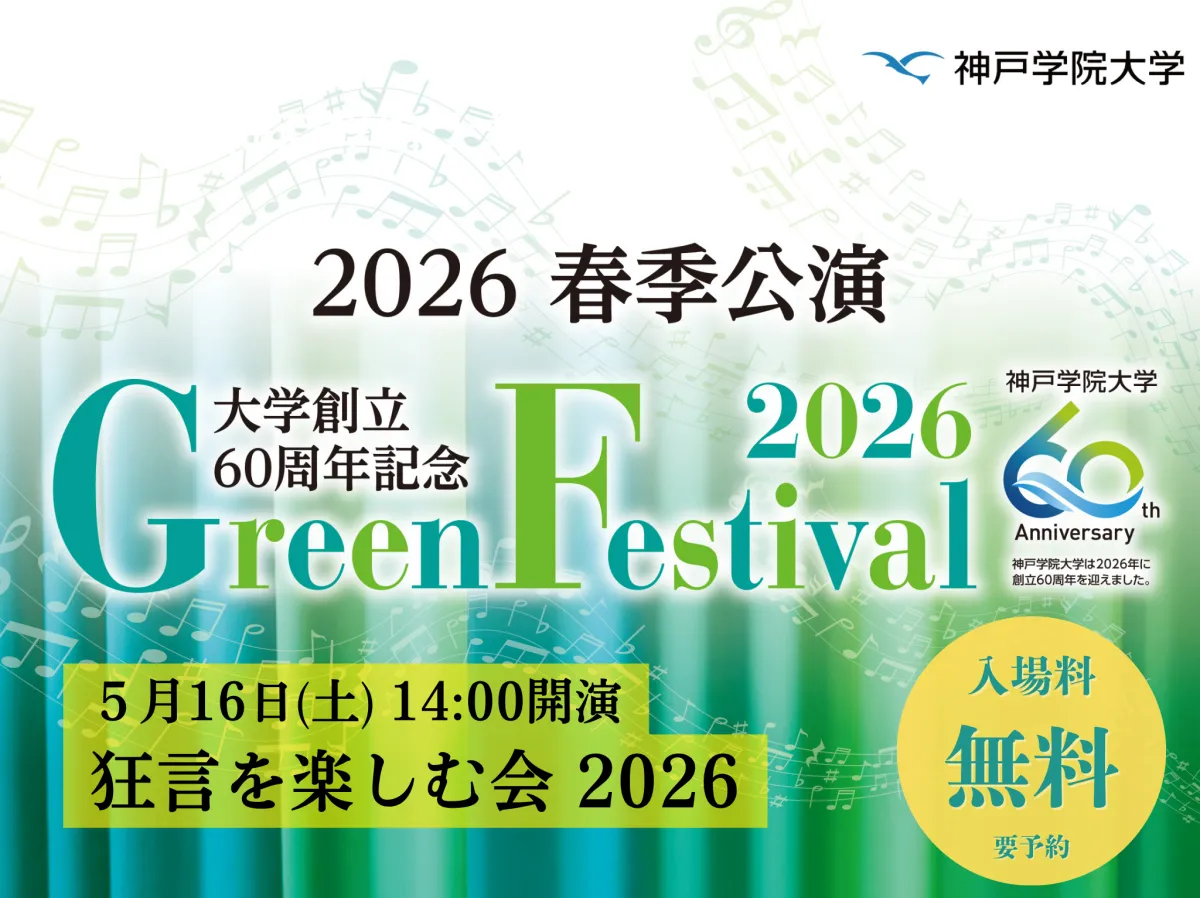 神戸学院大学では、1988年から地域の皆様に演劇や音楽などの舞台芸術を楽しんでいただくために、春と秋の年2回、グリーンフェスティバルを主催しています。今年(2026年)の春には、特に注目の催しとなる「狂言をたのしむ会」が5月16日(土)に行われます。このイベントは、全国的に有名な狂言師たちが集まる貴重な機会であり、演目も注目の作品が揃います。