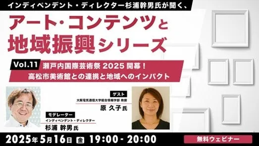 地域振興においてアートの重要性が高まっています。その一環として、株式会社クリーク・アンド・リバー社(以下C&R社)は、2025年5月16日(金)に無料のオンラインセミナー「インディペンデント・ディレクター杉浦幹男氏が聞く、アート・コンテンツと地域振興シリーズ vol.11」を開催します。本セミナーでは、地域振興におけるアートの役割や、高松市美術館との取り組みについて深く掘り下げていきます。