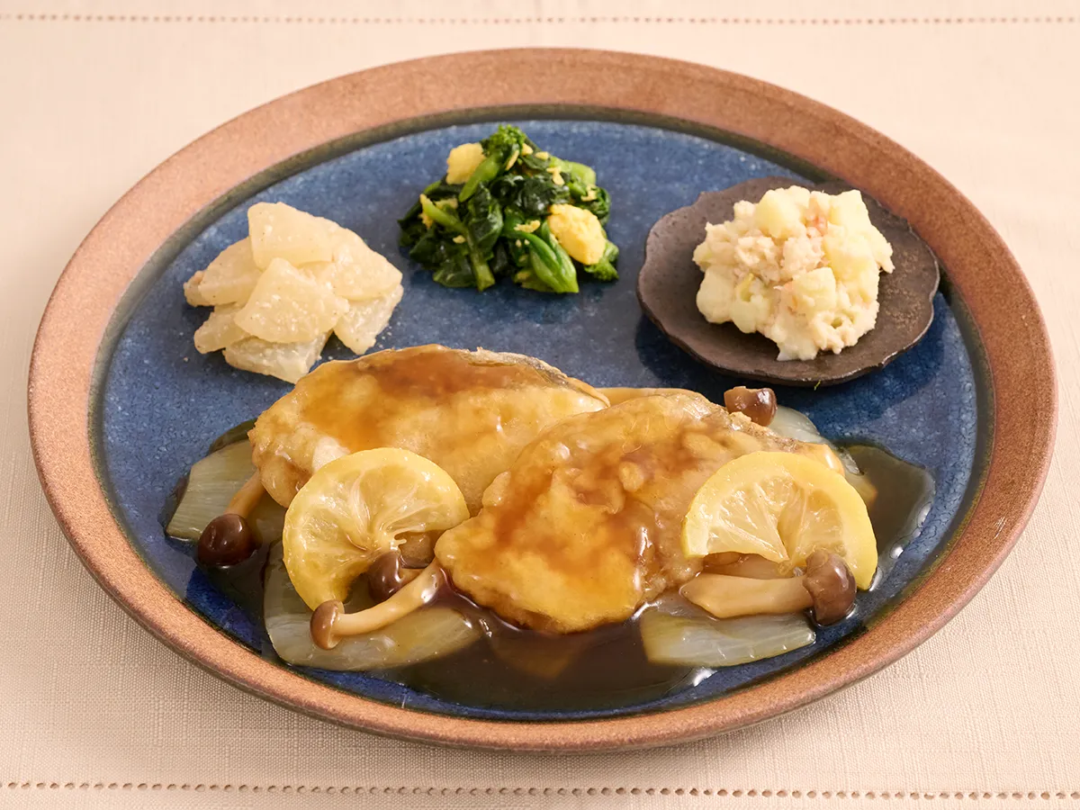 「たらのレモンあん」は、たらのやさしい旨味を活かしながら、仕上げのレモンでさらに味わいを引き立てた新作料理です。一口食べるごとに、淡白でありながらも豊かな味わいが口の中に広がります。また、副菜には、香り豊かな大根のごま和え、まろやかな味わいの菜の花のたまご和え、タルタルで和えたじゃがいものツナマヨが揃い、栄養バランスも考慮されています。
