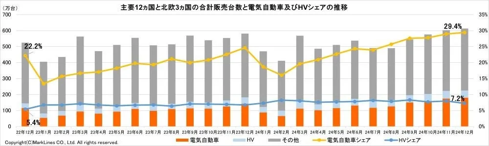 一方、ハイブリッド車(HV)の販売も注目されています。2024年12月の販売台数は44.4万台で、前年同月比で13.2%の増加を見せましたが、前月比では7.7%減少しました。年間としては493.0万台の販売が行われ、前年比17.0%の増加となりました。