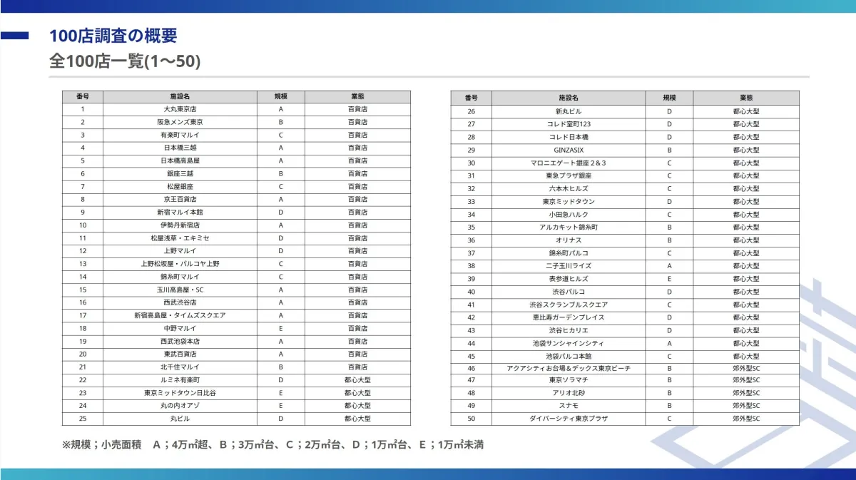 調査の中で特に注目すべきは、集客が多い店舗ランキングです。トップ10には百貨店や都心型の大型施設、駅ビルが名を連ね、一方で、郊外型ショッピングセンター(SC)・総合ディスカウントストア(GMS)・ホームセンター(HC)がワースト10に入っていることも指摘されました。