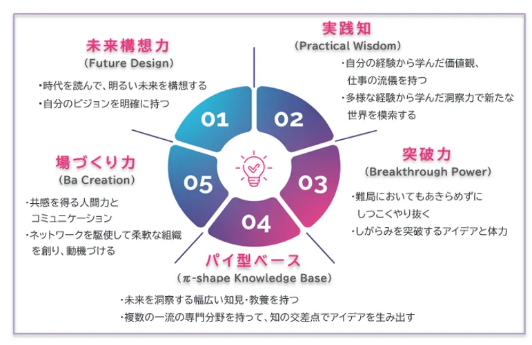 現代では、単なるマネジメントやリーダーシップにとどまらず、「イノベーターシップ」が求められる時代です。この概念は、革新的であり、周囲を巻き込む能力を持ち、ゼロベースのデザイン思考ができる資質を指します。これに基づき、参加者には「真善美」の思想を基盤とする「イノベーターマインド」を育成し、デジタルトランスフォーメーション(DX)やデータサイエンスなどVUCA(不確実な、変動の激しい、複雑な、曖昧な)時代に不可欠なスキルを習得させることが目指されています。