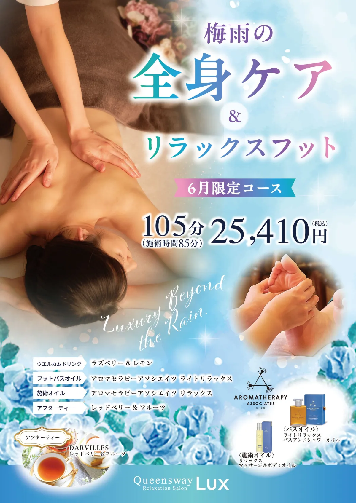 梅雨の季節は、湿度や気圧の変化によって心身のバランスが崩れやすくなります。そんな時期にぴったりのリラクゼーションコースが、QueenswayLUXから登場しました。その名も「梅雨の全身ケア&リラックスフット」。この特別プランは、2025年の6月限定で提供されます。具体的な施術内容は、お客様一人一人の身体の状態や疲れに応じてカスタマイズされるため、あなた自身に合った最適なケアを体験できます。