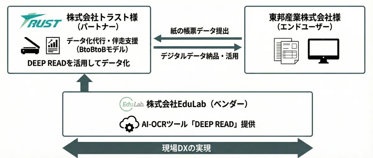 株式会社EduLabが提供するAI-OCRソリューション「DEEP READ」が、東邦産業株式会社の導入事例により、IT製品・SaaSの比較サイト「デジタル化の窓口」が主催する「SUCCESS STORY AWARD 2025」の現場DX部門を受賞しました。この受賞は、中小企業のデジタルトランスフォーメーション(DX)推進におけるパートナー連携の重要性を示す成功モデルとして評価されたものです。