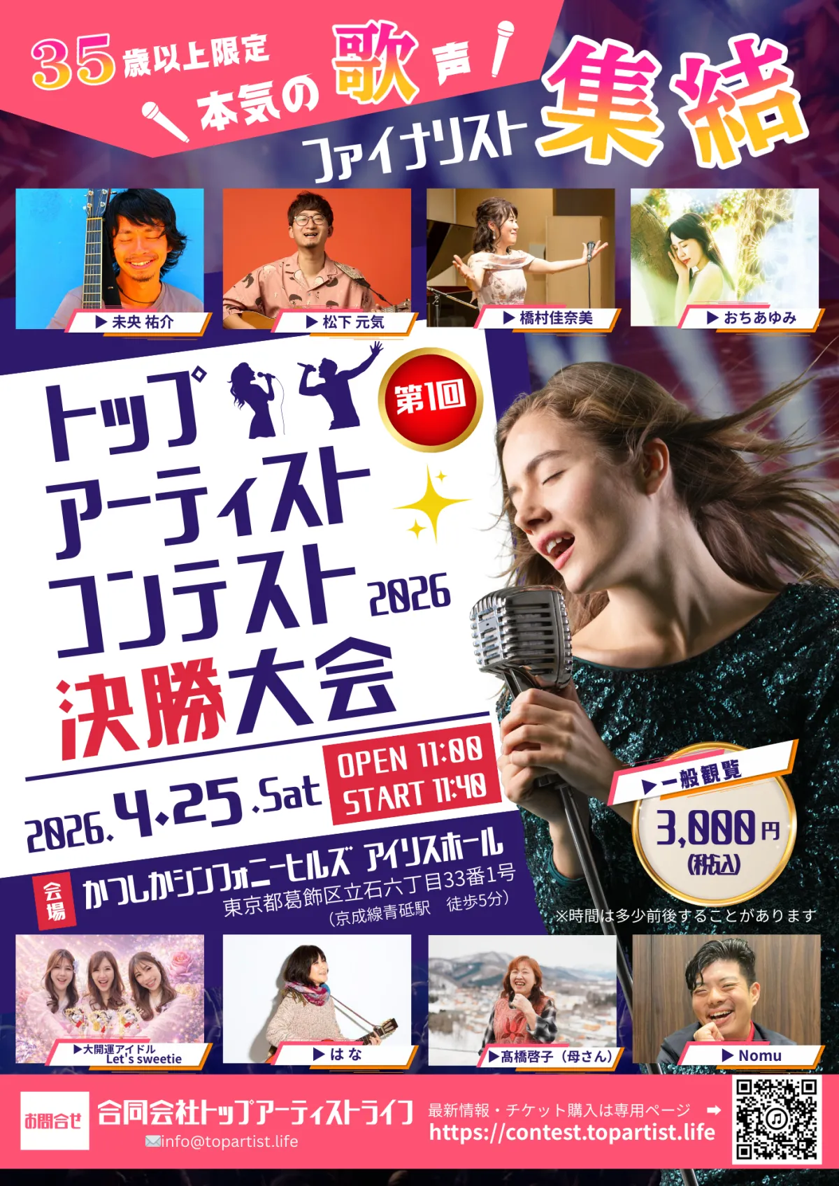 2026年4月25日(土)、東京都葛飾区にて開催される「トップアーティストコンテスト2026」は、35歳以上のシンガー限定の音楽イベントです。このコンテストは、年齢や環境に縛られずに、自分の思いを表現したいという大人たちの挑戦の場として設けられました。