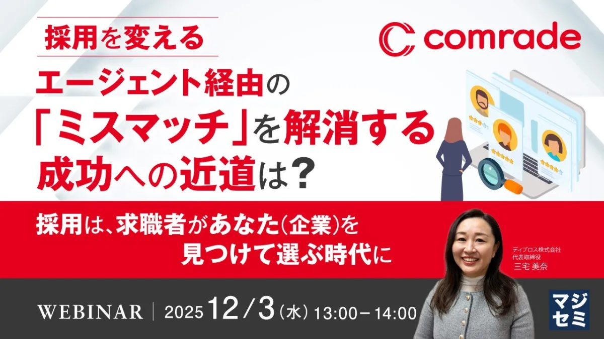 そこで、マジセミ株式会社は、中小企業向けのウェビナーを開催します。本セミナーでは、エージェント経由の採用から脱却し、自社での採用活動を強化するための具体的な方法を共有します。実際の事例を通して、効果的な採用戦略を参加者に伝授します。