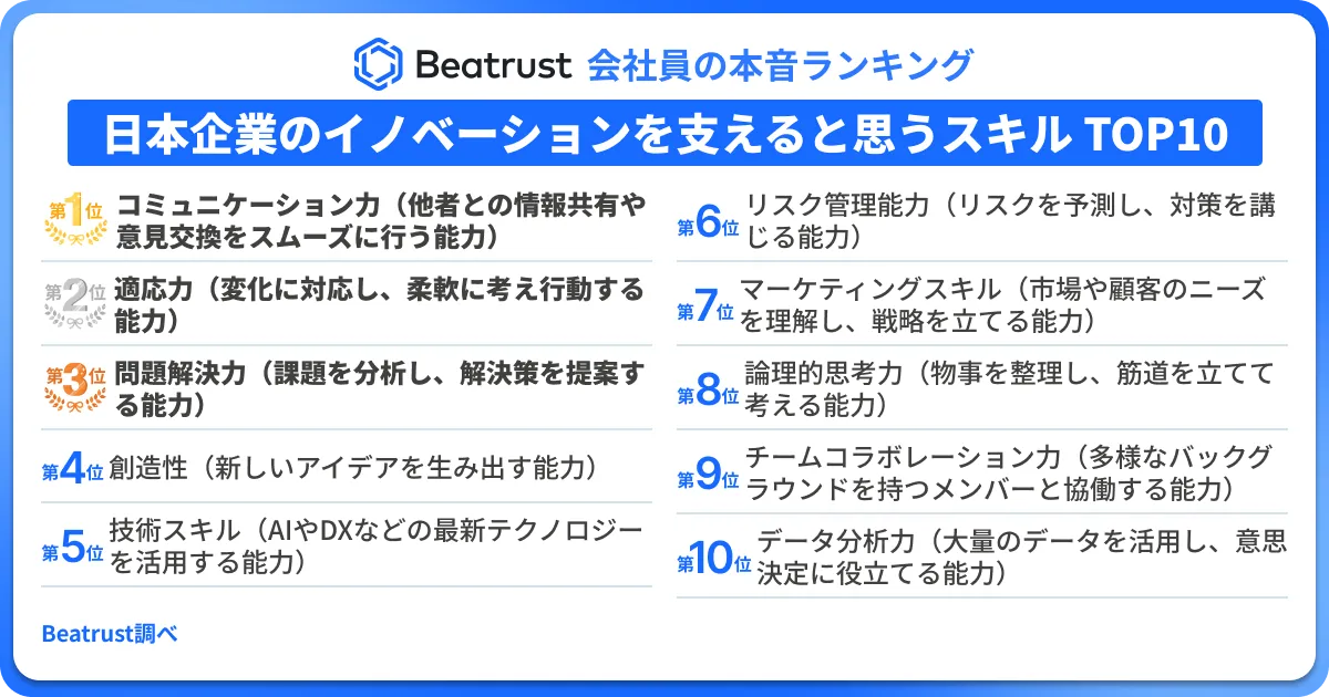 最近、会社員1,000人を対象に行われた意識調査によると、企業の成長を支えるために最も重視されるスキルは「コミュニケーション力」であることが判明しました。この調査は、Beatrust株式会社によって実施されました。