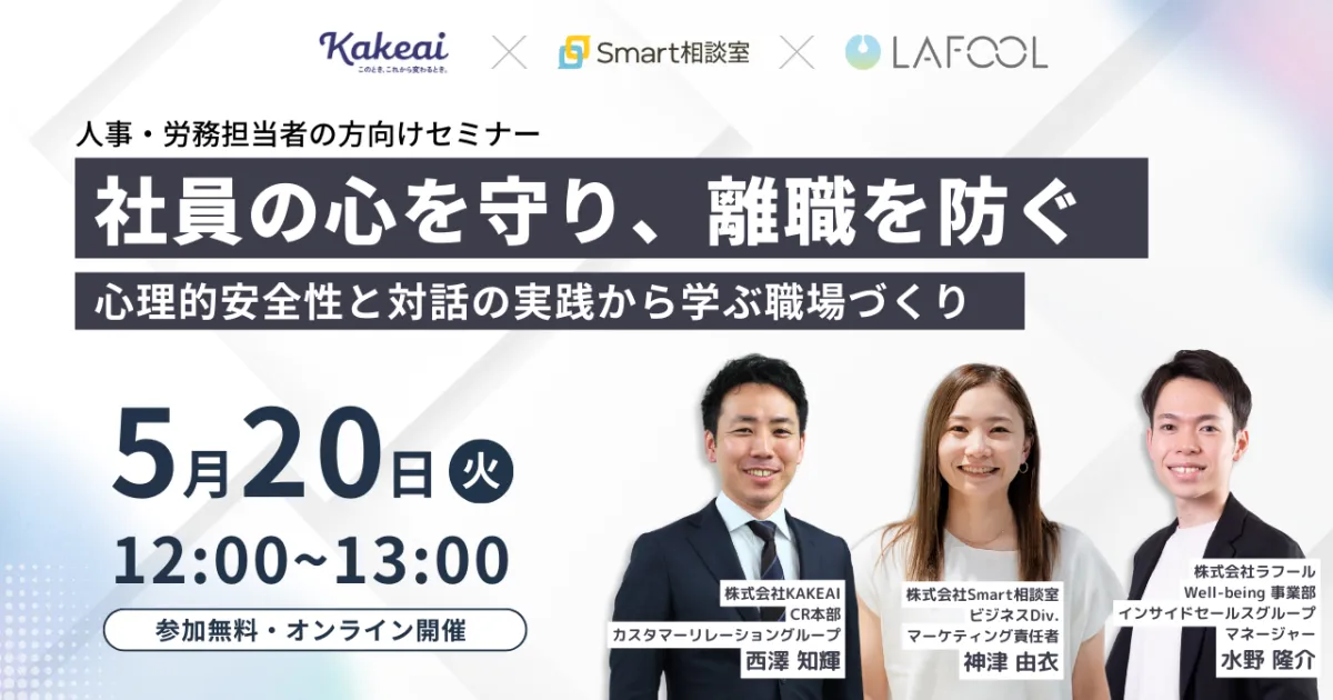 2025年5月20日(火)、株式会社KAKEAIはオンラインセミナー「社員の心を守り、離職を防ぐ ─ 心理的安全性と対話の実践から学ぶ職場づくり ─」を開催します。このセミナーは、働き方の多様化や人材不足に直面する企業向けに設計されており、従業員のメンタルケアを重要視しています。メンタル不調や突然の離職が増加する中で、多くの企業がその対策に苦心しており、未だに具体的な手法を模索している状態です。