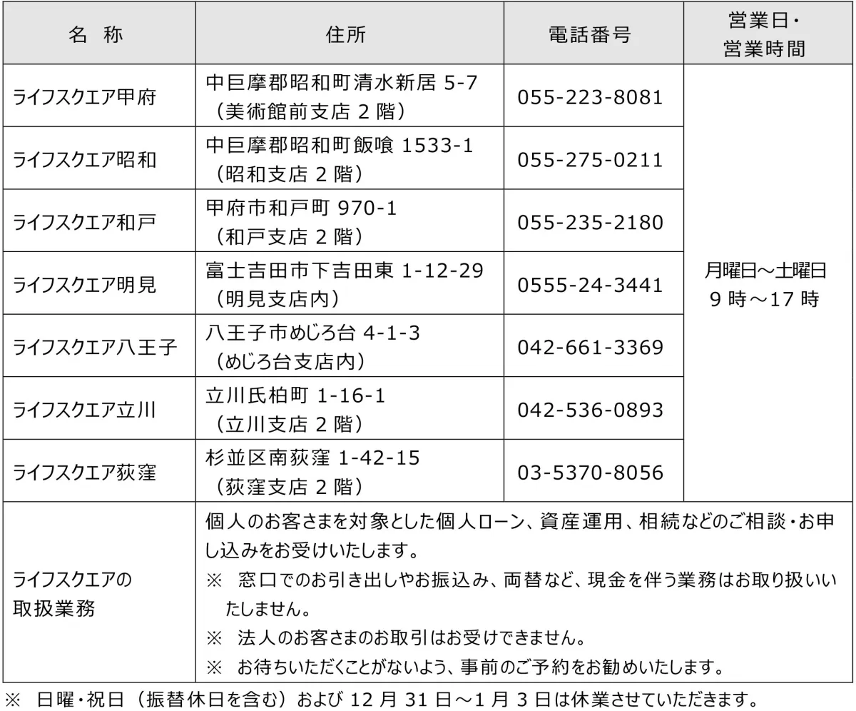 さらに、すべての「ライフスクエア」における営業日および営業時間が変更され、月曜日から土曜日の09:00から17:00に統一されます。この変更は、お客様のライフスタイルに合わせたフレキシブルなサービス提供を目的としており、より多くのお客様が気軽に利用できる環境づくりを進めています。