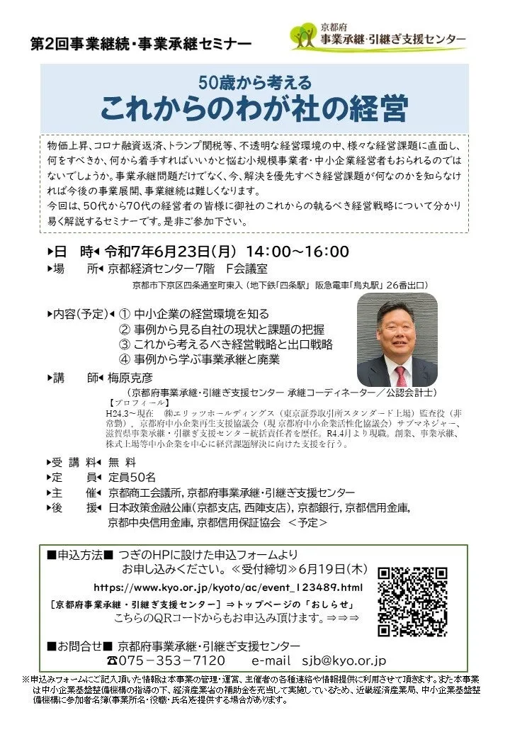 講師には、京都府事業承継・引継ぎ支援センターの公認会計士、梅原克彦氏を迎えます。彼の豊富な経験を基に、実践的かつ具体的なアドバイスを受けることができます。