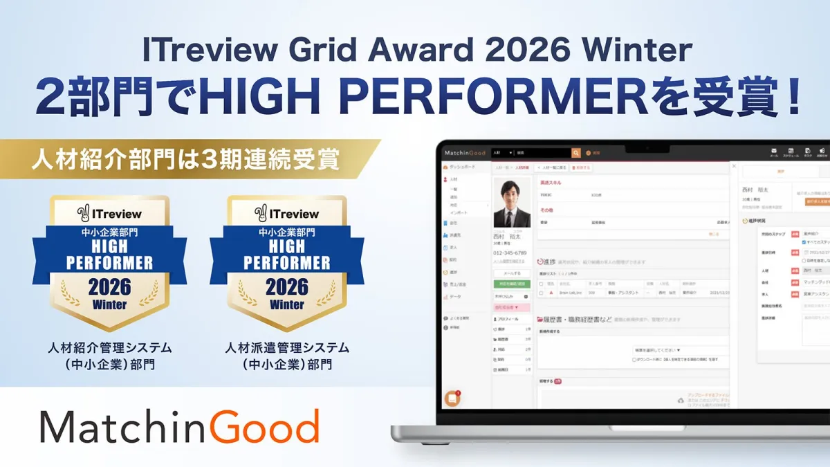 「MatchinGood」は、顧客満足度が非常に高い製品に贈られる「High Performer」を、まずは人材派遣管理システム(中小企業)部門で受賞しました。また、続いて人材紹介管理システム(中小企業)部門でも「High Performer」の称号を獲得し、3期連続での受賞という快挙を成し遂げました。これにより、MatchinGoodがいかに多くの顧客から信頼され、高評価を得ているかが明確になりました。