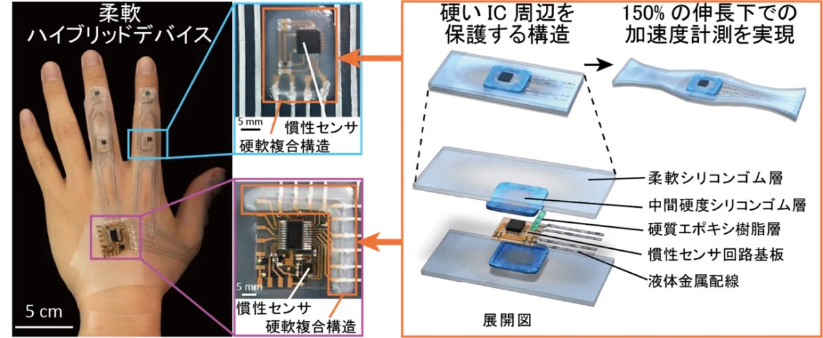 本研究で開発された「ストレッチャブルハイブリッドデバイス」は、硬質な集積回路(IC)と非常に柔軟な材料を組み合わせており、従来型デバイスと同等の測定精度を実現しています。