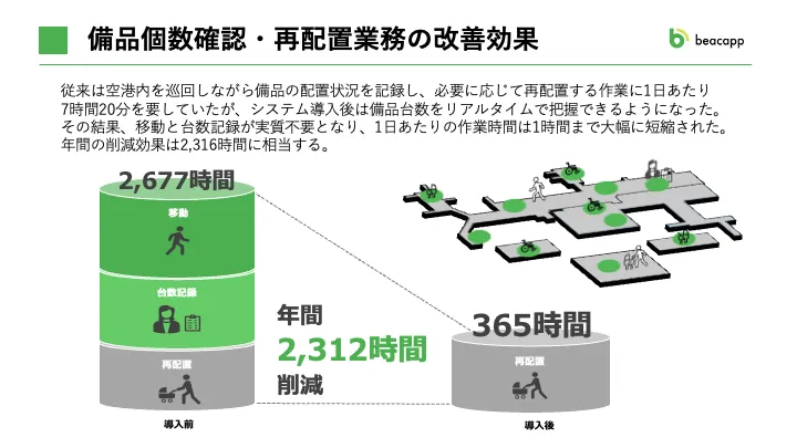 ビーキャップは、リアルタイムでモノの所在を可視化できる「Beacapp Tag」を開発し、ANA大阪空港での試験導入を経て、正式に使用が開始されました。これにより、小型ビーコンを795台の歩行補助具に取り付け、各保管場所に受信機を設置。空港スタッフは、普段使用しているiPadを通じて、即座に保管場所ごとの歩行補助具の台数を確認できるようになりました。