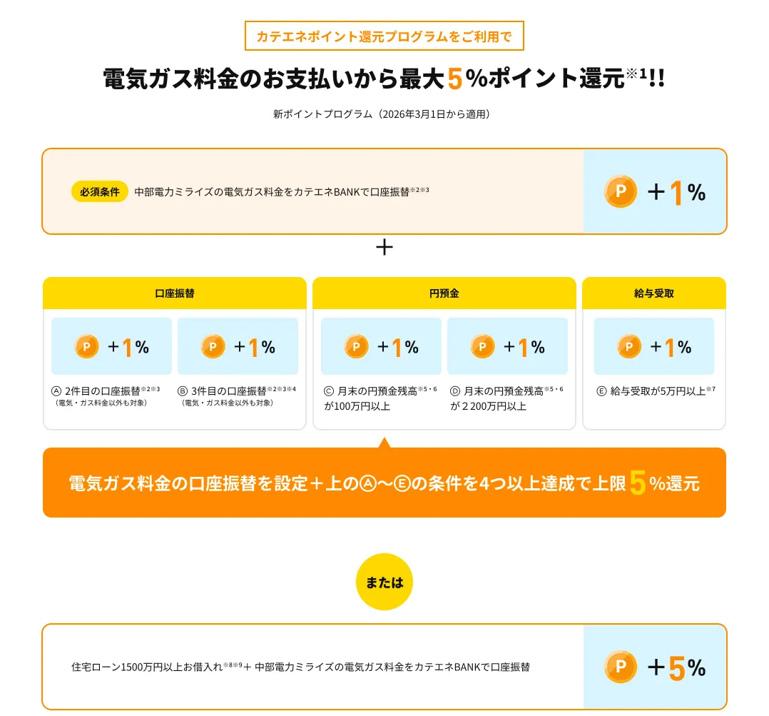 - - 還元率の変更: 電気・ガス料金のお支払いに対する還元は、新たに預金と給与受取の条件が追加され、最大5%のカテエネポイントが還元されます。還元の条件は、2026年3月1日から適用されます。