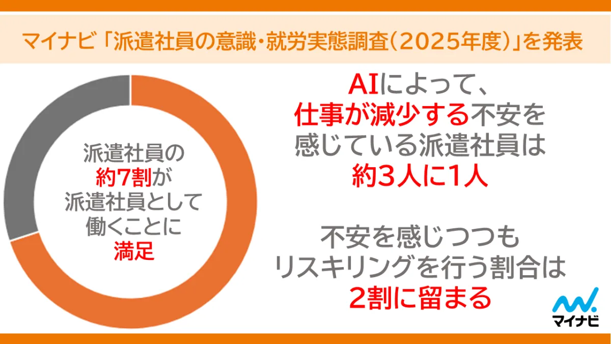 株式会社マイナビが実施した「派遣社員の意識・就労実態調査(2025年版)」の結果が発表されました。今調査は2019年から続くもので、今回で7回目となります。対象は20歳から59歳の派遣社員で、合計1,400名からの回答が得られました。この調査では、派遣社員が感じている満足度や不安、将来の希望など多角的に分析されています。