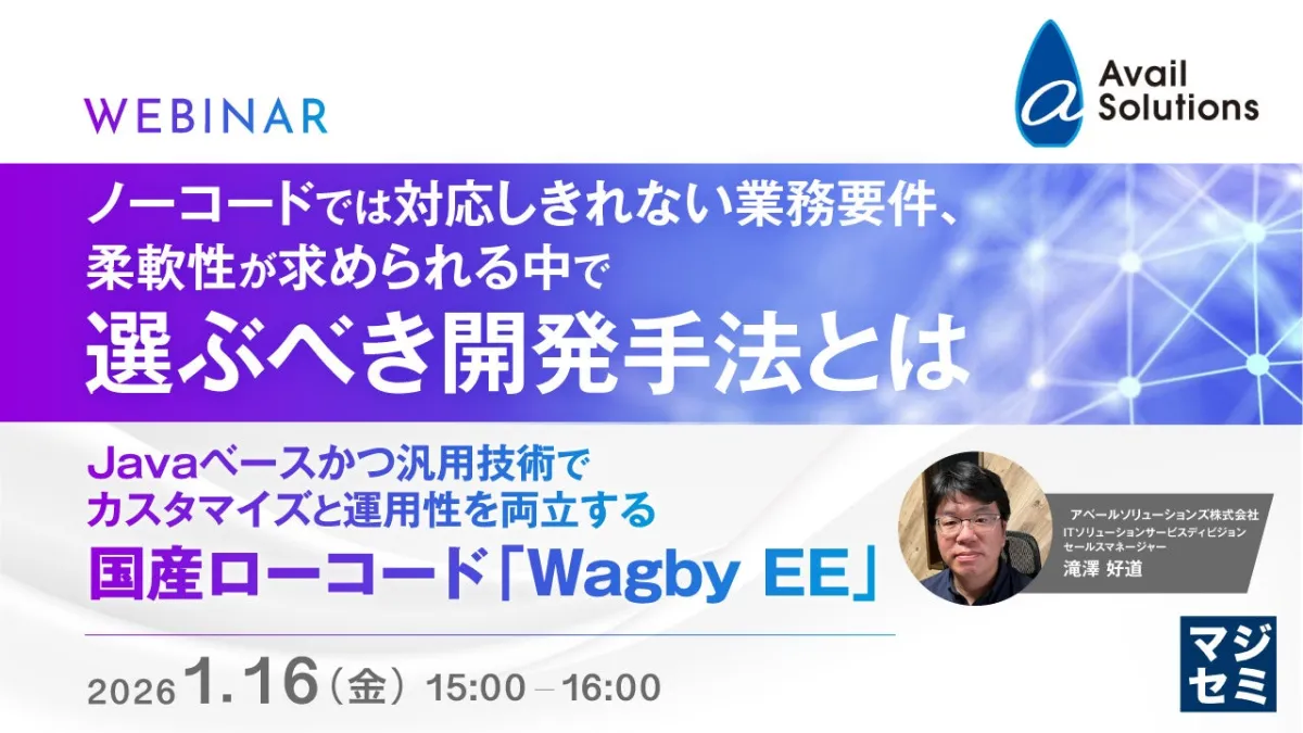 そこで注目されるのが、国産ローコード開発ツール「Wagby Enterprise Edition (Wagby EE)」です。このツールは、Javaベースの汎用技術を基にしており、ノーコードでは解決しきれない中〜大規模な業務システムへの対応が可能です。今回のセミナーでは、Wagby EEを使った業務システムの設計、実装、運用について具体的に説明されます。