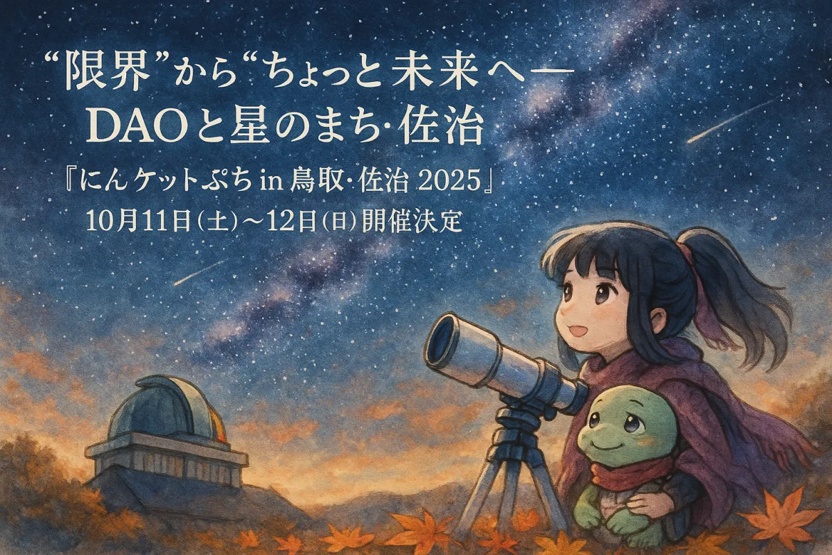 2025年10月、鳥取県鳥取市佐治町にて"にんケットぷち in 鳥取・佐治 2025"が開催されます。このイベントは、医療や福祉の課題を抱える高齢化社会の中で、分散型自律組織(DAO)を取り入れた新たな地方創生の試みです。参加者は地域資源を活かした様々なアクティビティを通じて、実際に地域創生に参加することができます。