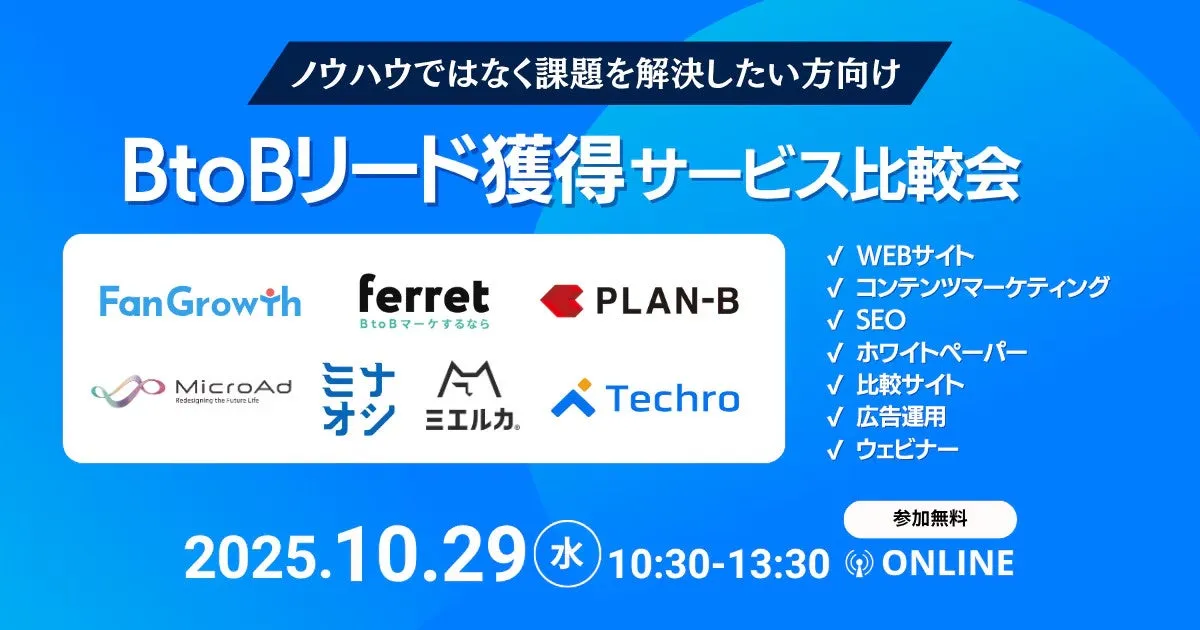 2025年10月29日(水)、株式会社ベーシックがエキサイト株式会社主催のセミナー「成功事例から施策活用シーンがわかる!BtoBリード獲得サービス比較会」に参加します。このイベントでは、BtoBマーケティングの最新トレンドや成功事例についての具体的な情報が提供され、参加者が自社に適したリード獲得サービスを見つける手助けとなるでしょう。