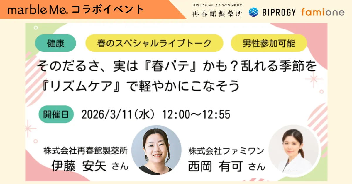 2026年3月11日、再春館製薬所、株式会社ファミワン、BIPROGY社によるスペシャルコラボイベントが開催されます。このイベントでは、ファミワンの西岡氏と、再春館製薬所の伊藤氏が登壇し、春特有の症状として認識される『春バテ』に焦点を当てたトークセッションが展開されます。ファミワンは、「子どもを願うすべての人によりそい、幸せな人生を歩める社会をつくる」というビジョンを掲げ、地域の人々に向けた多様な支援サービスを提供しています。