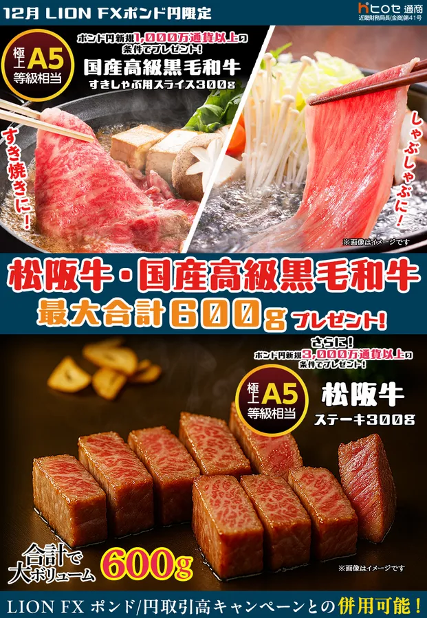 ヒロセ通商株式会社が、2025年12月1日から2026年1月2日まで、特別なキャンペーンを実施します。このキャンペーンでは、「LION FXポンド円」を利用した取引を行うと、なんと最大600gの高級国産黒毛和牛や松阪牛がプレゼントされるという豪華な内容です!