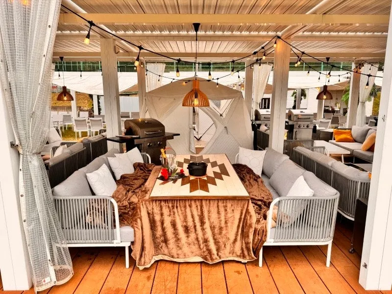 昭和フード株式会社が提供するこのデイキャンプは、冬の風物詩である「こたつ」と「鍋料理」を融合させたもの。特にラグジュアリーエリアには快適なソファー席が用意されており、風を遮るカーテンでプライベート感も確保されています。最大6名までのグループで、リラックスしながら楽しい時間を過ごせる作りになっており、隣接するブースを利用すればさらに大人数での利用も可能です。
