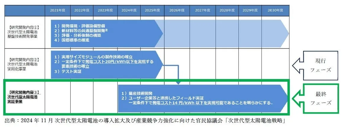 この事業は、経済産業省資源エネルギー庁が策定した「次世代型太陽電池の開発」プロジェクトの最終フェーズに位置づけられ、2030年度までに特定の条件下、つまり日射条件などを踏まえた上で、発電コスト14 円/kWh以下を達成することを目標としています。