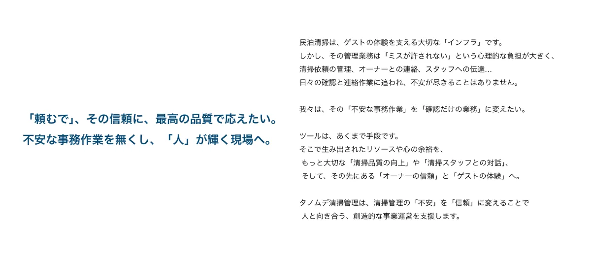 民泊清掃は、ゲストにとっての体験を支える大切なインフラですが、現場は「ミスが許されない」というプレッシャーに常にさらされています。これを軽減し、確認仕事だけに集中できる環境を整えることが我々の目標です。その結果、リソースや心の余裕を清掃品質の向上、スタッフとの対話、オーナーやゲストの信頼関係を深めるための時間に変えることができるのです。